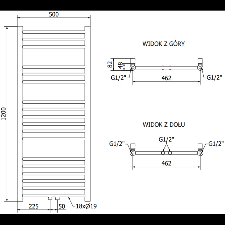 Specifikace výrobku: Výška: 1200 mm Šířka: 500 mm Hloubka: 48 mm Vzdálenost připojení: - 46 cm (boční) nebo 5 cm (prostřední) Barva: Černá RAL 9005 Materiál: Ocel Váha: 6,40 kg Reakce na oheň: A1 Pracovní teplota: max 95 °C Maximální pracovní tlak: 0,6 Mpa Topný výkon: - 75/65/20 °C - 389 W Spojení: ...viac