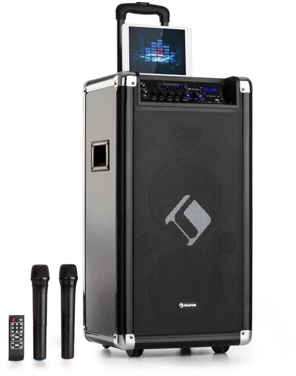 Objevte párty zařízení! PA systém Auna Moving 120 PA je ultimativním řešením pro párty, akce, karaoke setkání nebo jako domácí audio systém. Díky své mobilitě je kdekoli okamžitě připraven k použití a přeměňuje každé místo na zářící jeviště. Integrovaný mediální přehrávač PA párty systému Auna Moving 120 PA nabízí přístup k MP3 souborům a hudbě z mnoha datových nosičů, jako jsou SD karty a USB klíče a pomocí kabelu i z mnoha HiFi zařízení. LED displej usnadňuje navigaci v hudebních databázích. Rozmanitost nabídky přehrávání umožňují i smartphony a tablety s funkcí bluetooth, které lze ideálně položit na rovný povrch zařízení Moving 80: tato zařízení se dají jednoduše připojit celkem bez změti kabelů. Pro začínající rockové hvězdy je k dispozici i kytarové připojení. Pro jednoduché a pohodlné ovládání mediálního přehrávače je součástí balení dálkový ovladač. Díky XMR basové technologii od společnosti Auna jsou basy PA systému Moving 120 PA ještě dokonalejší: 2x 8 "(20 cm) subwoofer párty pořádně rozehřeje se jmenovitým výkonem 60 W a vrcholovým výkonem 200 W. 3" (7,3 cm) tweeter poskytuje křišťálově čisté středy a výšky. 7pásmový ekvalizér umožňuje individuální ovládání jednotlivých zvukových oblastí pro větší rozmanitost zvuku. Další tři regulátory poskytují ovládání efektu ozvěny, basů a výšek. Oslav svou hudbu! S bezdrátovým VHF mikrofonem karaoke zařízení Auna Moving 120 můžeš buď zazpívat na další karaoke párty, nebo zpívat své vlastní skladby. Díky nezávislosti systému nezáleží na tom, zda si doma, na zahradě, v parku, na pláži nebo kdekoliv máš chuť na párty. Integrovaná baterie s kapacitou 4,5 A / 12 V s indikátorem úrovně nabíjení funguje až 5 hodin zcela nezávisle od napájení ze sítě a může být také zásobená novou energií pomocí 12 V autobaterie. Vytahovací rukojeť, dvě tvrdé plastové kola a dvě rukojeti pro přenášení umožňují nekomplikované použití zařízení Moving 120 na libovolném místě. Nezáleží na tom, kde se slaví: se zařízením Moving 120 od společnosti Auna může začít párty!