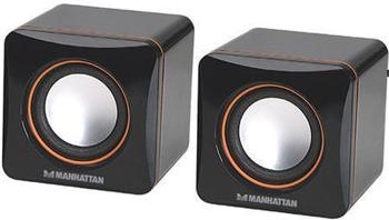 Compact design delivers big stereo sound for USB devices. Maximize audio experiences with the MANHATTAN 2600 Series USB Mobile Speaker System. Its compact, USB design delivers rich, full-range sound from notebook computers, netbooks, portable CD/DVD players and other USB-equipped mobile media devices. Solid, well-built enclosures help re-create a balanced, full-spectrum frequency response. The built-in USB cable quickly connects without special drivers, batteries or an external power supply to easily share music, improve presentations or enjoy movies, games and other multimedia content. The MANHATTAN 2600 Series USB Mobile Speaker System makes an ideal audio replacement or upgrade for mobile computing and is an alternative to headphones for enjoying favorite stereo sounds.Features: - Full-range stereo sound and compact size optimized for mobile listening - Easily connects to notebook computers and other USB-equipped devices - Dual external speakers improve stereo separation and sound field - Self-powered and easy to install – require no batteries or power adapter - Ideal to enjoy and share music and other audio - Shielded to prevent distortion and maintain clear, crisp sound.Specifications: Standards and Certifications - USB 1.1 - CE - FCC - RoHS - WEEE General - Frequency response: 90 Hz – 20 kHz - Signal-to-noise ratio (S/N): - Impedance: 4 Ohms - Power output: 3 W x 2 - Diameter, driver: 5 cm (2 in.) - All USB-supported operating systems Connections - USB Standard-A male - 3.5 mm - male Cables - USB, 0.9 m (3 ft.) - 3.5 mm, 0.9 m (3 ft.) Physical - Dimensions: overall, 6.5 x 6.5 x 7 cm (2.6 x 2.6 x 2.8 in.) - Weight: 0.44 kg (15.6 oz.) Package Contents - 2600 Series USB Mobile Speaker System - Quick install guide.