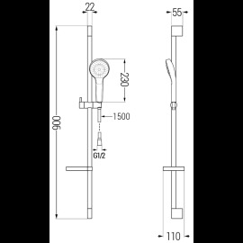 Specifikace výrobku: Materiál tyče: Nerezová ocel, ABS Povrch tyče: Chromovaná Výška: 900 mm Šířka tyče: 22 mm Délka od zdi: 110 mm Miska na mýdlo Posuvný držák na sprchovou hlavici Nastavitelné montážní drážky Materiál hlavice: Umělý materiál Povrch hlavice: Chromovaná/ bílá Počet funkcí: 3 Materiál hadice: PVC Povrch hadice: Chromovaná Délka hadice: 150 cm Mosazné koncovky Hladký povrch se snadno udržuje v čistotě Rotační koncovky zabraňují kroucení Elastický odolný materiál odolný vůči roztahování a ohýbání