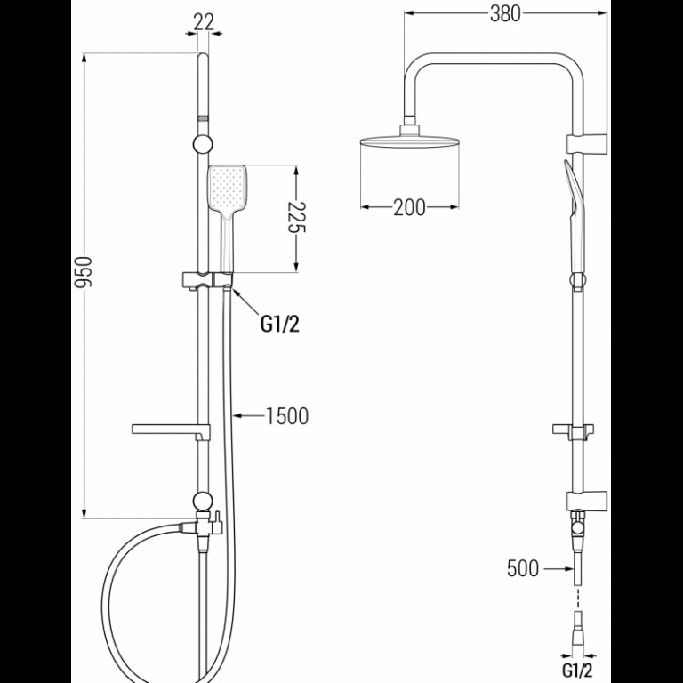 Specifikace výrobku: Materiál sloupu: Nerezová ocel, ABS Povrch sloupu: Černá Výška: 950 mm Šířka sloupu: 22 mm Délka od zdi: 380 mm Posuvný držák na sprchovou hlavici Nastavitelné montážní drážky Materiál dešťové sprchy: Umělý materiál Povrch dešťové sprchy: Černá Velikost dešťové sprchy: 200 mm Materiál hlavice: Umělý materiál Povrch hlavice: Černá Počet funkcí: 1 Připojení: G 1/2" Výška hlavice: 225 mm Šířka hlavice: 80 mm Výška hlavice: 240 mm Šířka hlavice: ø105 mm Výška hlavice: 230 mm Rozměry hlavice: ø108 mm Materiál hadice: Kryt z nerezové oceli Povrch hadice: Černá Délka hadice: 150 cm Připojení: 1/2" Mosazné koncovky Elastický odolný materiál odolný vůči roztahování a ohýbání Materiál baterie: Mosaz Hlavice: Keramická Povrchová úprava: Černá Šířka: 150 mm