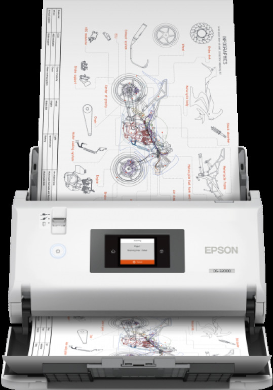 Rychlý a kompaktní A3 skener Epson DS-3200.Technologie.Typ skeneru: Skener s podavačem.Optické rozlišení (ADF): 600 dpi x 600 dpi (horizontálně x vertikálně).Skenovací rozlišení: 50 dpi x 1.200 dpi (horizontálně x vertikálně).Optické rozlišení: Main 600 dpi x Sub 600 dpi.Minimální velikost dokumentu ADF: 50,8 mm x 69 mm (horizontálně x vertikálně).Maximální velikost dokumentu ADF: 304,8 mm x 5.588 mm (horizontálně x vertikálně).Formáty papíru: A3, A4, A5, A8, A7, A6, Vizitky, Pohlednice, Legal, B5, B6, B4, Tabloid, Plastové karty.Hloubka barev: Vstup: 10 bitů Barva / 30 bitů Černobíle, Výstup: 8 bitů Barva / 24 bitů Černobíle.Ultrazvuk. senzor: Yes.Application: Vysoká kapacita, Běžná kancelář.Skener.Optical Sensor: CIS (Kontaktní snímač obrazu).Zdroj světla: Technologie ReadyScan LED.Výstupní rozlišení: 600 dpi.Rychlost skenování.Rychlost skenování: Černobíle: 90 Str./min - Barva: 90 Str./min měřeno pomocí Velikost: A4, Rozlišení: 300 dpi, Černobíle: 180 obr./min - Barva: 180 obr./min měřeno pomocí Velikost: A4, Rozlišení: 300 dpi.Zpracování papíru/médií.Kapacita papíru ADF: 120 Listy.Gramáž papíru ADF: Automatické podávání: 20 - 413 g/m2, Manuální podávání:20 - 413 g/m2.Typ automatického podavače dokumentů: Jednoprůchodové oboustranné skenování.Spolehlivost denní kapacity: 40.000 Strany.Kapacita zásobníku papíru: 120 Listy Standardní.Automatický podavač dokumentů: 120 Strany.Velikost medií: A3, A4, A5, A6, A7, A8, C4 (Obálka), C5 (Obálka), C6 (Obálka), Pohlednice, Vizitky.Duplexní skenování: Yes.Funkce skenování.Funkce a vlastnosti: Pokročilá funkce odstranění/vylepšení barev, Přeskočení prázdných stran, Odstranění děr, Automatická korekce zkosení, Vylepšení RGB barev, Automatická rotace obrazu, Vylepšení textu, Potlačení moiré efektu, Rozpoznávání čárového kódu.Výstupní formáty: BMP, JPEG, TIFF, multi-TIFF, PDF, prohledávatelné PDF, zabezpečené PDF, PDF/A, JPEG (barevně / stupnice šedé), PNG, docx, xlsx, pptx.Vlastnosti komprese souborů: Komprese TIFF (JPEG(7), CCITT G4, LZW), Komprese PDF, Komprese JPEG.Advanced document integration: E-mail, FTP, Microsoft SharePoint®, Tisk, Webové složky, Složky v síti, USB, Počítač (Epson Document Capture Pro), Služba Microsoft SharePoint s aplikací Epson Document Capture Pro.Korekce obrazu: Odstranění prachu, Korekce barev, Maska rozostření s redukcí šumu.Skenovací objem: 40.000 stran za den.Možnost připojení.Rozhraní: USB - kompatibilní se specifikací USB 2.0, USB 3.0.Obecné informace.Napájení: AC 100 V - 240 V.Spotřeba energie: 20 W (Operation), 11 W Připraveno, 1,4 W (úsporný režim), 0,1 W (vypnutí).Rozměry výrobku: 371 x 208 x 219 mm (šířka x hloubka x výška).Hmotnost výrobku: 5,8 kg.Ovladače: TWAIN, WIA, ISIS (Stažení z webu), Epson Scan2 (TWAIN), ICA (Mac).Obsažený software: Epson Document Capture (Mac only), Epson Document Capture Pro (Windows only), Epson Scan 2.kompatibilní operační systémy: Mac OS 10.6+, Windows 10, Windows 7, Windows 8, Windows 8.1, Windows Server 2003, Windows Server 2008 (32/64bit), Windows Server 2012 R2, Windows Server 2016, Windows Vista, Windows XP SP3.Max. hladina hluku: Provoz: 6,7 B (A).Akustický tlak: Provoz: 53 dB (A).Max. hladina hluku: Provoz: 67 dB (A).vlhkost vzduchu: Provoz 15% - 80%, skladování 15% - 85%.Teplota: Provoz 5° C - 35° C, skladování 60° C - 25° C.Obsah dodávky: Síťový adaptér, Hlavní zařízení, Kabel USB 3.0, User guide, Návod k použití (CD).Doplňky: Roller Assembly Kit.Ostatní.Záruka: 12 měsíců u dodavatele.LCD displej: Typ: Barevně, Dotyková obrazovka, Úhlopříčka: 6,8 cm.