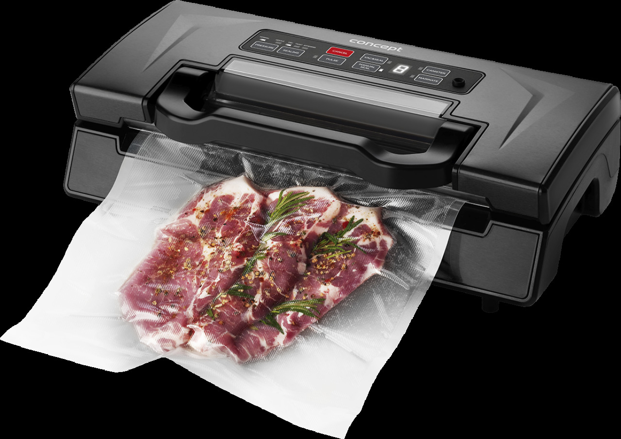 Vakuová svářečka Concept VA0060 Nemrhejte zbytečně penězi za vyhozené potraviny, když jim můžete jednoduše prodloužit životnost s vakuovou svářečkou Concept VA0060 Profi. Tento praktický kuchyňský pomocník s integrovanou fólií nejenže zajistí delší životnost suchých i vlhkých potravin, včetně potravin v dózách a uchová jejich chuť a aroma, ale současně ušetří místo v lednici nebo mrazáku a urychlí marinování masa. Výběr ze 7 provozních režimů Vakuová svářečka zaujme kvalitním provedením s horním krytem z tmavého nerezu a přehledným displejem s přednastavenými programy. Její rychlý chod zajišťuje kvalitní DC motor a se svým podtlakem 0,85 barů a dvojitým svárem přináší vakuovačka perfektní utěsnění fólií. Umožňuje přitom vakuovat suché i vlhké potraviny, nebo dokonce potraviny v dózách a díky snadnému ovládání pomocí speciálních tlačítek její obsluhu zvládne každý. Automatické odsávání vzduchu S funkcí Vac and seal můžete jednoduše spustit automatické odsávání vzduchu a následné svaření sáčku, který poté můžete uložit do lednice nebo mrazničky. Pokud chcete mít přesnou kontrolu nad odsáváním, při využití tlačítka Pulse vacuum můžete odsávání kdykoli přerušit. Zamezíte tak rozmačkání křehkých potravin. Vakuování dle struktury potravin Vyberte si jednoduše druh vakuování podle struktury potravin. Zvolte režim Dry pro suché potraviny, režim Moist pro středně mokré potraviny nebo Extended pro mokré potraviny s větším množstvím tekutin. S funkcí Pressure pak můžete nastavit vhodný tlak odsávání. Zatavení s funkcí Manual seal Pokud nepotřebujete odsávat vzduch, ale pouze zatavit folii, zvládnete to jednoduše pomocí funkce Manual seal. Při stisknutí vyhrazeného tlačítka v průběhu odsávání s programem Vac and Seal vakuovačka přestane odsávat a začne svářet. Ideální příprava na grilování Také milujete grilování a chcete si zajistit tu nejlepší přípravu masa? Marinování ve vakuu představuje ten nejlepší a nejzdravější způsob uchování masa před grilováním, kdy se díky němu póry masa otevřou a lépe tak absorbují marinádu. Při marinování ve vakuovacích nádobách navíc funkce Marinate nastaví ideální tlak pro odsávání.