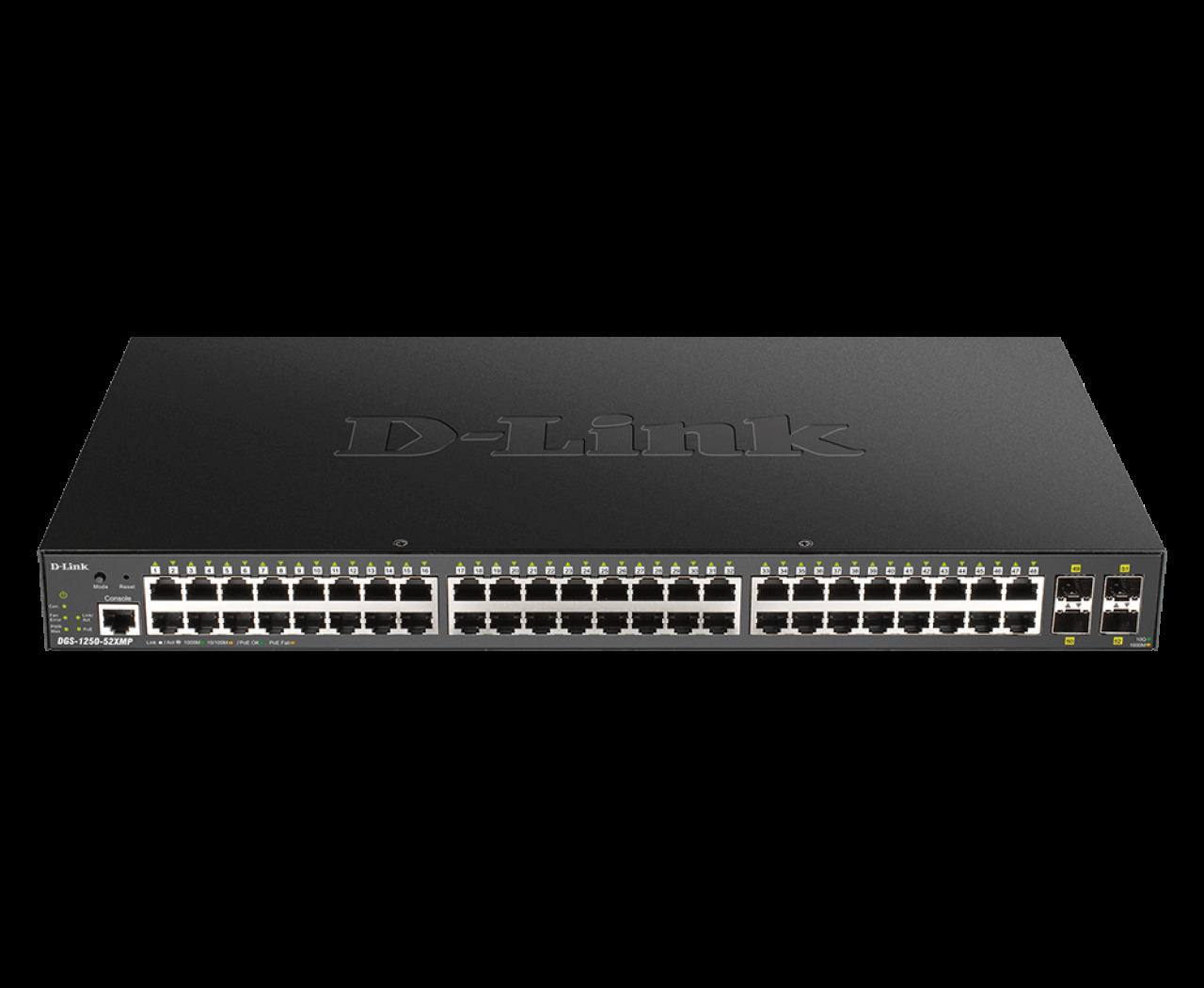 DGS-1250-52XMP D-Link DGS-1250-52XMP Smart switch 48x Gb PoE+, 4x 1G/10G SFP+, 370W D-Link DGS-1250-52XMP je L2/L3 Gigabit Smart Managed switch osazený 24 porty 10/100/1000Base-T RJ-45 s podporou napájení 802.3at PoE+ (max. 30W na port) a 4 dvourychlostními 1G/10G SFP+ porty pro uplink nebo pro připojení ...viac