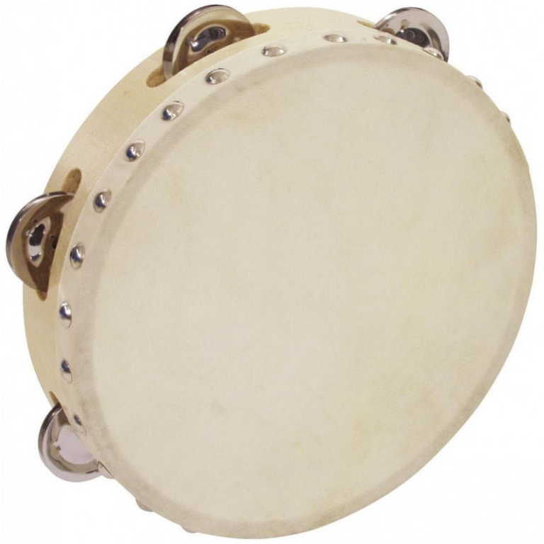 Více rezonantní tamburína. Velikost: 20,32 cm (8"). 6 párů plíšků. Přírodní kůže přibitá na dřevěném rámu.