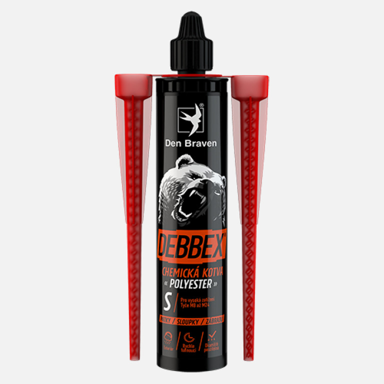 Den Braven chemická kotva 300 ml Chemická kotva je dvousložkový chemický kotvicí systém na bázi polyesterových pryskyřic pro velice rychlé kotvení s vysokou pevností, vytvr. Den Braven chemická kotva 300 ml Chemická kotva je dvousložkový chemický kotvicí systém na bázi polyesterových pryskyřic pro velice rychlé kotvení s vysokou pevností, vytvrzující chemickým procesem. Vlastnosti Okamžitě použitelný, snadno aplikovatelný Zkrácený vytvrzovací čas – krátká doba tuhnutí Vysoká pevnost kotvených materiálů bez rozpěrných tlaků 1kN = 100kg Rychle tuhnoucí Obsahuje styren, který při aplikaci chemické kotvy po dobu směšování způsobuje charakteristický zápach. Z tohoto důvodu je tento výrobek vhodný zejména pro venkovní aplikace a otevřené větrané prostory. Vyzrálá chemická kotva již žádný zápach nezpůsobuje. Případně zvolte další produkty, které styren neobsahují, např. Chemická kotva bez styrenu POLYESTER SF nebo Chemická kotva VINYLESTER SF Použití Chemické kotvení ocelových tyčí, patek zábradlí a šroubů Kotvení do podkladů z betonu, tvárnic, plného zdiva, dutých cihel apod. Kotvení mechanického upevňování výkladů, garážových vrat, výkladních skříní apod.