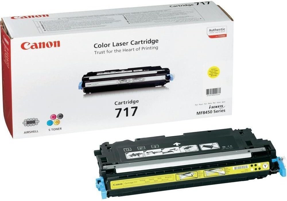 Canon 717 Yellow Toner 4k pages (2575B002) Každý jednotlivý diel kazety Canon 717 Y – vrátane toneru v CRG-717 – je účelovo vytvorený tak, aby pracoval v úplnej harmónii so všetkými tlačovými produktami spoločnosti Canon. S cieľom dodávať trvalo kvalitné výsledky vyvinula spoločnosť Canon vyspelý S (Spherical) toner a EF toner (Energy-saving Fine Toner). K dosiahnutiu výnimočnej ostrosti a krásy využíva S toner častice jednotnej veľkosti a tvaru, pričom jadro týchto častic je tvorené voskom, ktorý umožnuje eliminovať z procesu fixácie olejovú zložku. Výsledkom je jasnejšie a zreteľnejšie zobrazenie. Spolupráca fixačnej technológie On-Demand a EF toneru (Energy-saving Fine Toner) spoločnosti Canon dodáva kvalitné výsledky a znižuje náklady na energiu. Len originálne kazety Canon sú spolu s vyspelými tonermi a presnými recyklovateľnými dielmi vyrábané v tých najčistejších a dokonale bezprašných podmienkach, čím sú zaručené trvale čisté, ostré a ekologicky šetrné výsledky. Žltá tonerová kazeta 717Y s výdatnosťou až 4000 strán Podporované tlačiarne CRG-717Y: Canon i-SENSYS MF8450 2233B002.