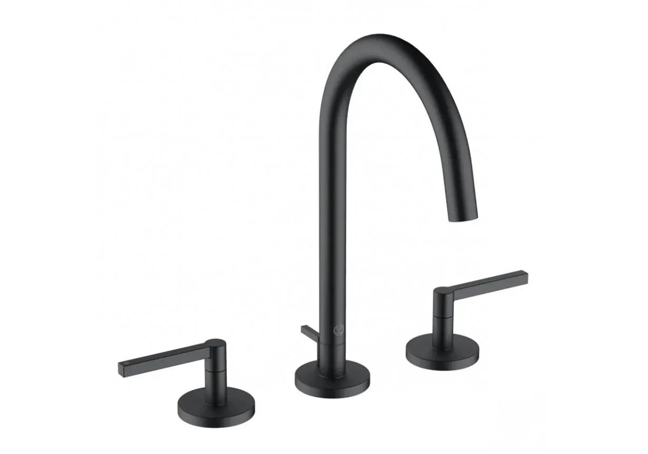 Kohoutková stojánková umyvadlová baterie s výpustí. V černé barvě. Průtok baterie je 5,6 litrů/minutu. S matným povrchem.