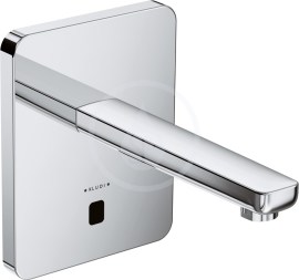 KLUDI Zenta elektronická umyvadlová baterie, chrom 3850205 elektronická umyvadlová baterie DN 15 vrchní díl hranatá rozeta napájení přes síťový adaptér 230 V nebo 6 V Lithium baterie CR-P2 nástěnná montáž perlátor M 24 x 1 průtok 5 l/min při 3 bar s optickou registrací objektu vyložení 190 mm ilustrační foto.