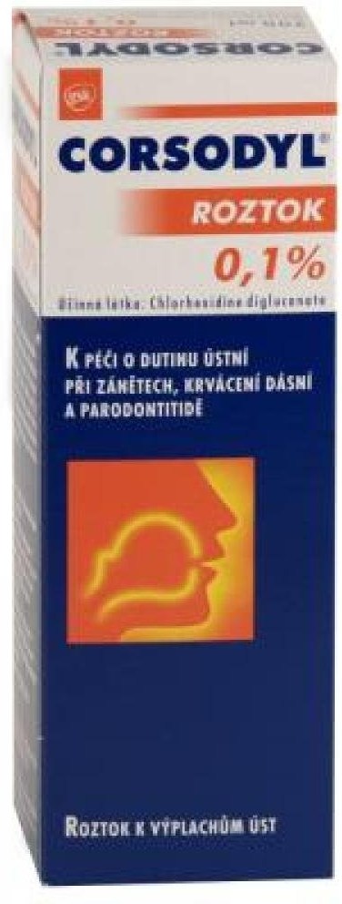 Na výplachy úst pri zápaloch, krvácaní ďasien a parodontitíde. K starostlivosti o ústnu dutinu v tehotenstve. Pre pacientov so zubnými mostíkmi, implantátmi, zvýšenou kazivosťou zubov a ortodontickými strojčekmi. Pre opakované 14 denné používanie.Použitie:.doplnok liečby povlakom podmieneného zápalu ďasien a parodontitídy.k dosiahnutiu vyššej úrovne ústnej hygieny a inhibície zubného povlaku u pacientov s:.rozsiahlymi fixnými mostíkmi.dentálnymi implantátmi.fixnými ortodontickými strojčekmi.zvýšenou kazivosťou zubov.k starostlivosti o ústnu dutinu v tehotenstve.na výplachy úst pri liečbe a prevencii recidivujúcich aftov a protetickej stomatitídy.ako súčasť starostlivosti o ústnu dutinu pri závažných celkových ochoreniach (hemoblastózy, poruchy zrážanlivosti, ochorenia AIDS) a pri liečbe hyperpláziou gingívy podmienených užívaním niektorých druhov liekov (hydantoinmi, blokátormi kalciových kanálov, valproát, cyklosporín A).ako prostriedok na dosiahnutie dostatočnej úrovne ústnej hygieny u jedincov dlhodobo neschopných dodržiavať základné hygienické návyky.Pre ústne vody s nižšou koncentráciou chlórhexidínu sa pozrite na zvyšok našej ponuky.Dávkovanie a spôsob použitia:.Roztok je vhodné používať v dvojtýždňových cykloch: po 2 týždňoch používania sa aplikácia na 2-4 týždne preruší a po uplynutí tejto doby sa cyklus opakuje. Na výplachy úst 2x denne, najlepšie ráno a večer po jedle a vyčistení zubov. Odmerný kalíšok naplniť po značku (15ml). Ústa vyplachovať po dobu 1 minúty, vypľuť.Široké spektrum účinku a dlhodobá antipovlaková aktivita:.Účinná látka - chlórhexidín diglukonát má široké spektrum účinku, ktoré zahŕňa grampozitívne i gram-negatívne baktérie, mnoho plesní a vírusov spôsobujúcich infekčné ochorenie a zápaly v ústnej dutine. Pôsobí bezprostredne po aplikácii do úst, kde vytvára depo, z ktorého sa postupne uvoľňuje počas 8-12 hodín. Tak je zaistená dlhodobá účinnosť pri použití 2x denne.Správny spôsob použitia = minimum vedľajších účinkov:.Vedľajšie účinky v podobe prechodnej zmeny zafarbenia jazyka a ďalších tkanív sa väčšinou prejavujú pri dlhodobom a príliš častom používaní alebo pri prekročení odporúčaného dávkovania. Všetky tieto zmeny sú plne vratné a vymiznú po vysadení lieku. Rýchlejšie ich možno odstrániť intenzívnym čistením zubov alebo ordinačným vyčistením. Dôležitá je tiež voľba správnej koncentrácie s ohľadom na dôvod použitia, dodržiavanie odporúčanej dávky, frekvencia a dĺžka používania, realizácia výplachov až po dôkladnom mechanickom vyčistení zubov a obmedzení fajčenia a konzumácie kávy, čaju, červeného vína počas používania.Upozornenie:.Účinnosť chlórhexidínu znižuje laurylsulfát sodný (SLS), ktorý je obsiahnutý vo väčšine zubných pást. V kombinácii s Corsodylom je preto vhodné používať zubnú pastu neobsahujúcu SLS, napr. PARODONTAX.Vedľajšie prejavy pri užívaní prípravku:.Pri prekročení odporúčaného dávkovania a spôsobu použitia: reverzibilné zmeny farby povrchu jazyka a farby zubov. Výskyt zmien zafarbenia možno znížiť dodržiavaním odporúčaného času a frekvencie používania a obmedzením fajčenia, pitia kávy, čaju a červeného vína počas používania prípravku. Nežiadúce reakcie na liek a podráždenie sliznice sú celkom ojedinelé.Balenie:.Sklenená fľaša 200 ml so skrutkovacím uzáverom.Zdroj: www.ch.gsk.cz.