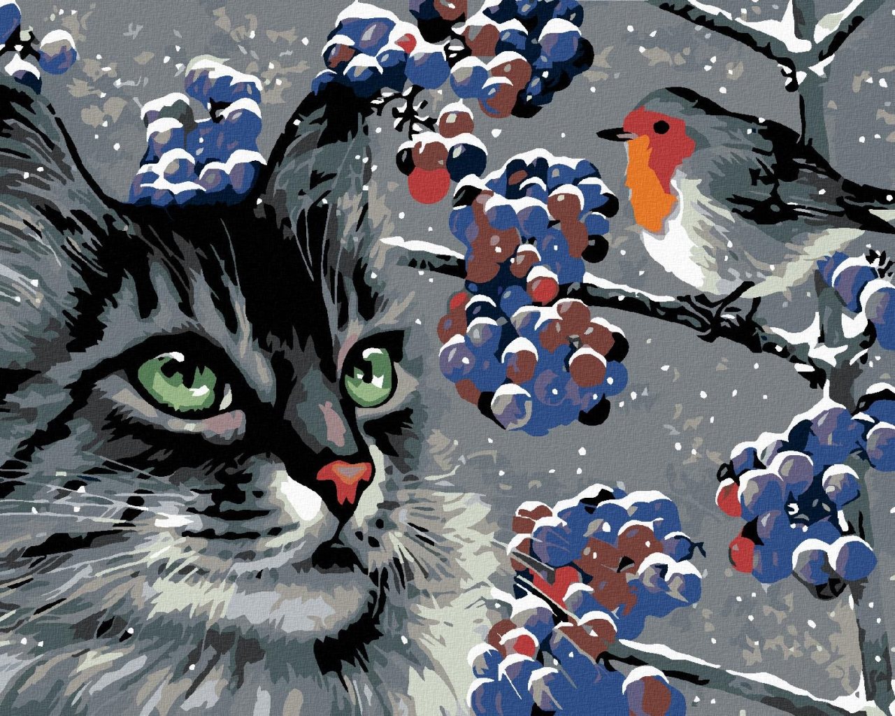 Zuty Maľovanie podľa čísel - Číhajúci sivý kocúr a vtáčik, 50 x 40 cm, napnuté plátno na rám