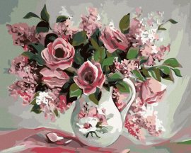 Zuty Maľovanie podľa čísel - Ruže a orgovány v maľovanej váze, 100 x 80 cm, napnuté plátno na ráme