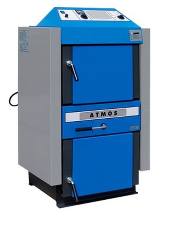 Kotle jsou konstruovány pro spalování hnědouhelných briket na principu generátorového zplynování s použitím odtahového ventilátoru (S), který odsává spaliny z kotle. Těleso kotlů je vyrobeno jako svařenec z kvalitních ocelových plechů o tloušžce 6 až 3 mm. Je tvořeno dvěma nad sebou posazenými komorami, vrchní slouží jako zásobník paliva, spodní jako spalovací komora a popelník. Mezi nimi je umístěn nový, patentem chráněný nerezový otočný rošt, který umožňuje dokonalé zplynování paliva a snadné odstraňování popela. V zadní části tělesa kotlů je svislý spalinový kanál, opatřený ve vrchní části zatápěcí záklopkou. Vrchní část spalinového kanálu je opatřena odtahovým hrdlem pro připojení na komín. Primární a sekundární vzduch je předehříván na vysokou teplotu pro dosažení vysoké účinnosti a kvalitního spalování Předepsaným palivem jsou hnědouhelné brikety o výhřevnosti 19 - 23 MJ.kg-1. Výhody zplynovacích kotlů na hnědouhelné brikety ATMOS: -Velký zásobník paliva - dlouhá doba hoření - Vysoká účinnost - primární i sekundární vzduch je předehříván na vysokou teplotu - Ekologické spalování - kotel dle ČSN EN 303-5 třídy 4, EKODESIGN 2015/1189 - Odtahový ventilátor - bezprašné vybírání popela, kotelna bez kouře - Chladící smyčka proti přetopení – bez rizika poškození kotle - Automatické vypnutí kotle po dohoření paliva – spalinový termostat - Pohodlné vybírání popela – velký keramický spalovací prostor pro popel - Kotel bez trubkovnice - snazší čištění (mimo AC35S) - Malé rozměry a nízká hmotnost - Vysoká kvalita Regulace kotlů Elektromechanická - regulaci výkonu provádíme záklopkou ovládanou regulátorem tahu, typ FR 124, který automaticky podle nastavené výstupní teploty vody (80 - 90 °C) otevírá či přivírá vzduchovou klapku. Nastavení regulátoru výkonu je nutno věnovat zvýšenou pozornost, poněvadž regulátor kromě regulace výkonu plní další důležitou funkci, že zajišťuje kotel proti přetopení. Kotel je dále vybaven regulačním termostatem umístěným na panelu kotle, který ovládá ventilátor dle nastavené výstupní teploty (80 - 85 °C). Na regulačním termostatu by měla být nastavena teplota o 5 °C nižší než na regulátoru tahu FR 124. Od roku 2002 jsou kotle navíc vybaveny spalinovým termostatem, který slouží k vypnutí odtahového ventilátoru po dohoření paliva. Kotle pracují na snížený výkon do 70 % jmenovitého výkonu i bez ventilátoru. Každý kotel je možné vybavit u zákazníka elektronickou regulací ATMOS ACD 01 pro řízení celého topného systému v závislosti na venkovní teplotě, pokojové teplotě a čase. Tato regulace je schopna řídit i samotný kotel s ventilátorem s mnoha dalšími funkcemi. Jmenovitý výkon (kW) : 26 Předep. tah komína (Pa): 20 Hmotnost kotle (kg) : 297 Objem vody (l) : 45 Obsah násypky (dm3) : 65 Elektrický příkon (W) : 50 Připojovací napětí (V/Hz) :230/50 Předepsané palivo : hnědouhelné brikety o výhřevnosti 19 - 23 MJ.Kg-1 Náhradní palivo (na zátop): Suché dřevo o výhřevnosti 15 - 18 MJ/kg-1, průměr 80 - 120 mm a o vlhkosti 12 - 20 % Max. délka dřeva (mm) : 330 Minimální teplota vratné vody při provozu: 65 °C Účinnost v celém rozsahu výkonu: 86,0 Kvalita spalování - CO mg/m3:.